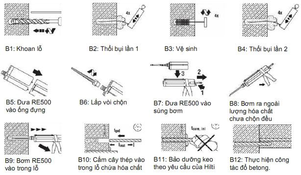 Quy trình khoan cấy thép chờ bằng Keo Hilti hoặc keo Ramset
