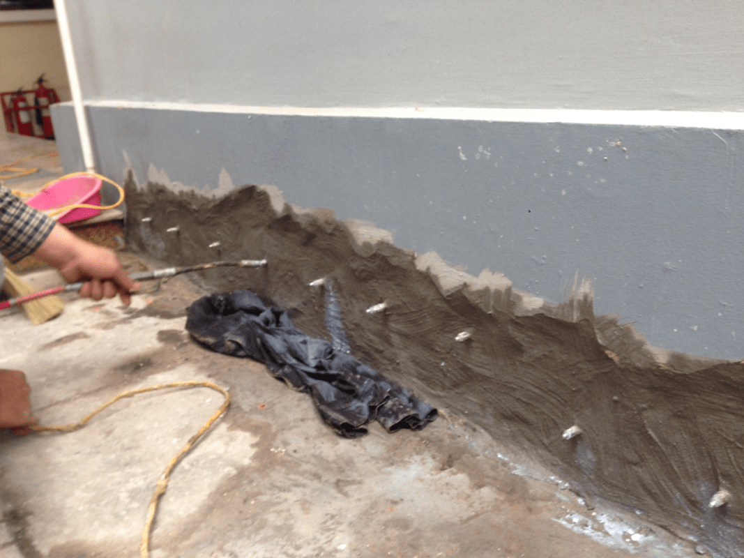 - Chặn các điểm rò rỉ nước bằng QUICSEAL 105 chống thấm thẩm thấu, để lớp nền khô đến khi không còn thấy hiện tượng nước chảy ra nữa