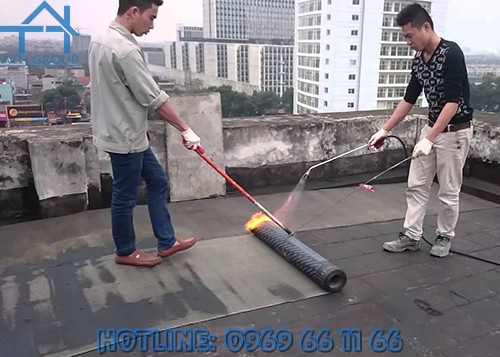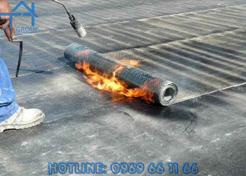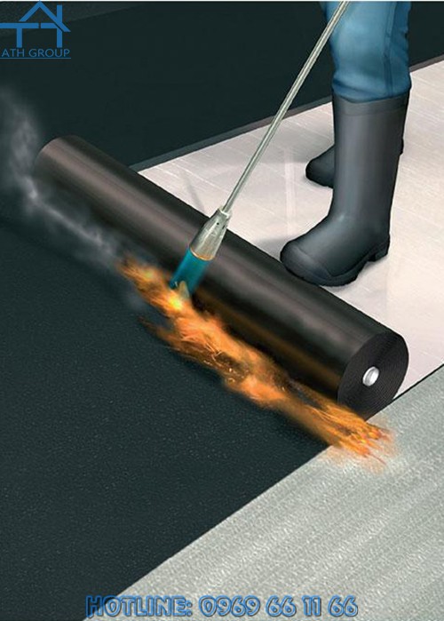 - Sử dụng phương pháp khò nhiệt, khò đều mặt màng phía dưới đến khi lớp màng mỏng chảy và kết dínhvới lớp bitum quét lót.