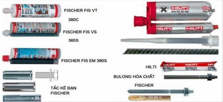 Bu lông hóa chất được sử dụng hiện nay thông thường có hai dạng, một là sử dụng với hóa chất dạng ống (ống thủy tinh hoặc ống nhựa nylon) : HVA( hilti) , RM ( Fisher), Maxima( Ramset), Hai là sử dụng với Túyp keo đóng gói lớn: Keo Hilti Re 500, Fisher EM 390…