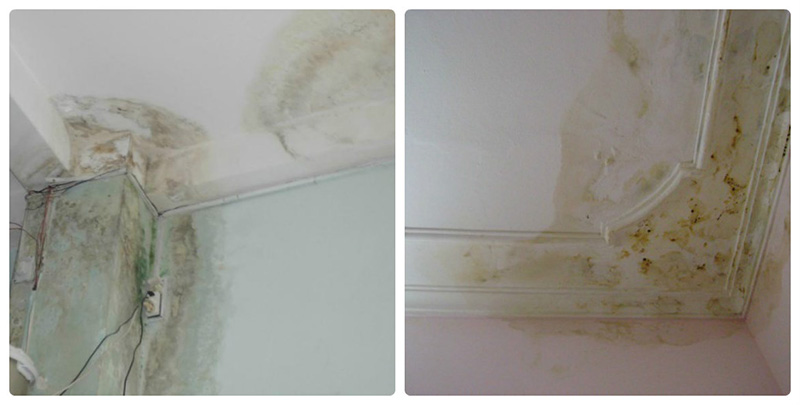 - Bạn có thể tìm thấy các mảng bị đổi màu trên trần nhà từ màu tối ẩm ướt sang màu xanh đen của rêu mốc. Bạn nên sửa chữa các vấn đề rò rỉ trần sớm có thể để bảo vệ tính bền vững cấu trúc của căn hộ của bạn.
