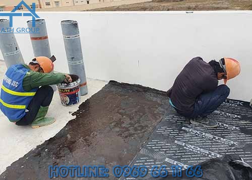 - Các vị trí yếu phải gia cố: Thao tác này kéo dài chất lượng bám dính và tuổi thọ màng. Vì vậy chú trọng gia cố các điểm yếu như: góc tường, khe co giãn, cổ ống.