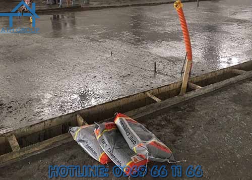 - Để cho GPS Hardtop hút hơi ẩm trên bề mặt bê tông và khi còn ẩm dùng máy xoa nền xoa.