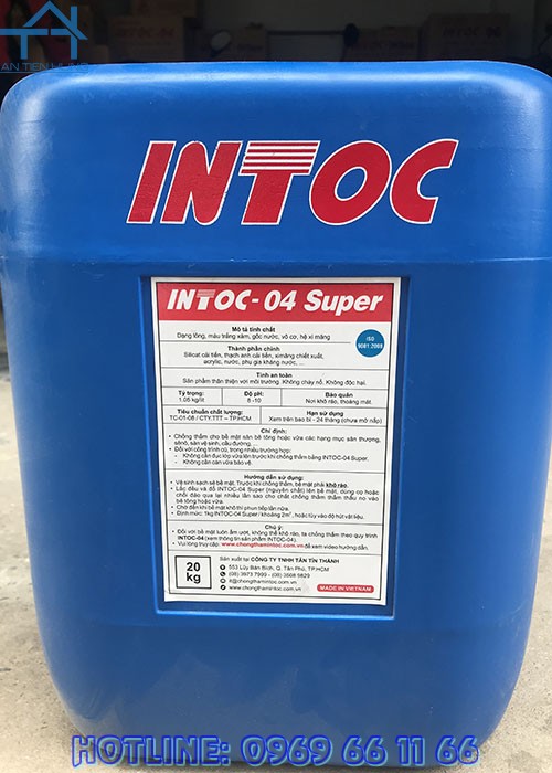 INTOC-04 SUPER với thành phần chính là silicat cải tiến, thạch anh cải tiến, xi măng chiết xuất, acrylic, nước và các phụ gia kháng nước. Sau pha chế tạo dạng lỏng màu trắng xám gốc nước, vô cơ, hệ xi măng dùng quét trực tiếp lên bề mặt vật liêu cần chống thấm.