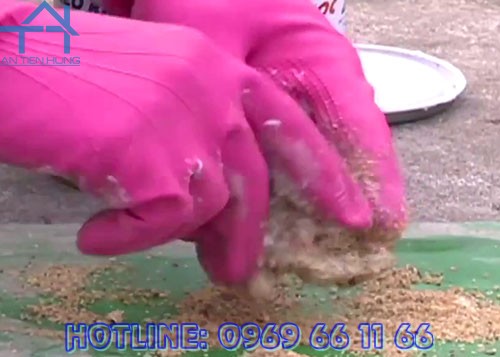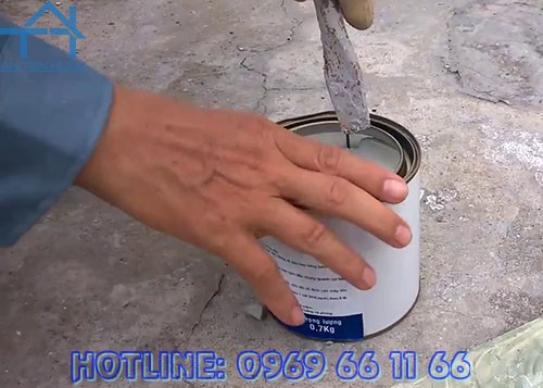 - Đối với các vị trí ngoài trời như vết nứt sân thượng, tường đứng, lỗ đinh.. trước khi trét cần trộn keo với cát khô theo tỷ lệ 1 : 1 (nếu trong thành phần keo có sẵn cát thì không phải trộn);