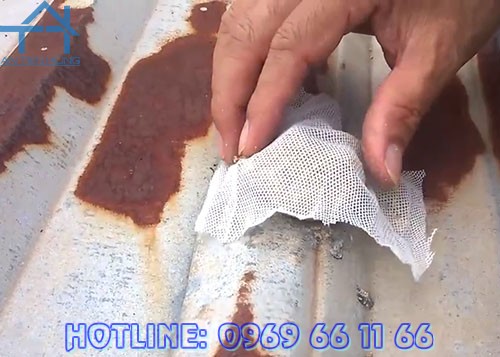 - Đối với mép tiếp giáp giữa các tấm tôn: trét keo vào 2 mặt tấm vải mềm rồi ép chặt vào giữa 2 tấm tôn sau đó cố định các mép tôn