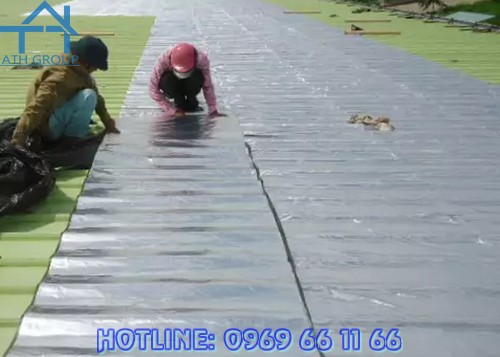- Bóc bỏ lớp màng silicon và cẩn thận dán màng chống thấm sao cho diện tích chồng mí tối thiểu là 50mm, sau đó dán màng từ giữa ra hai mép để không còn không khí ở bên trong.