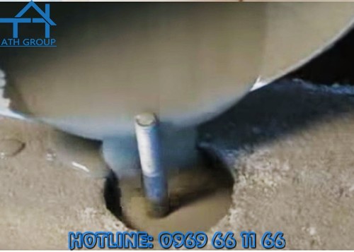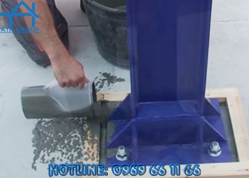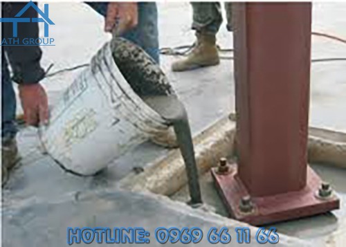 - Rót trực tiếp vào các vị trí cần fill đầy: cổ ống thoát sàn, chân đế cột thép, neo bu lông, bệ máy, bệ móng