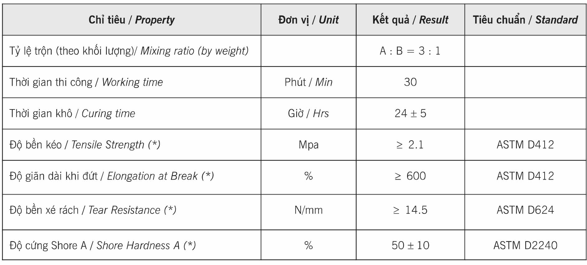 - Định mức cho lớp phủ dày 1mm: 1.3kg/m2.