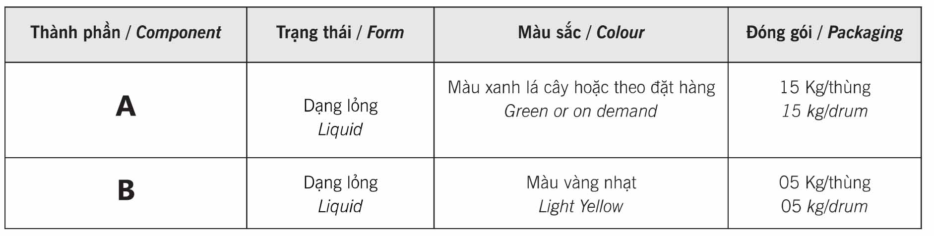 - Neomax 201 gồm có 2 thành phần dạng lỏng, thành phần A có màu xanh lá cây hoặc theo đặt hàng được chứa trong thùng 15kg/thùng, thành phần B có màu vàng nhạt được chứa trong thùng 05kg/thùng.