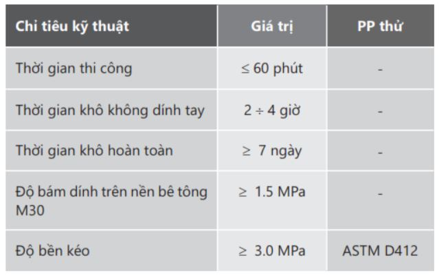 - Thời gian thi công không quá 60 phút (phụ thuộc vào nhiệt độ môi trường);