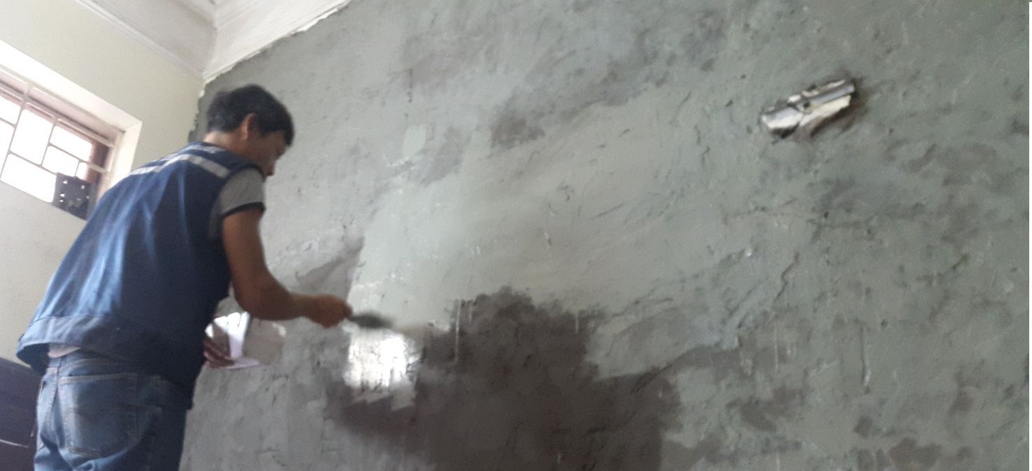 Bước 2: Vệ sinh sạch sẽ bề mặt gạch, tưới ẩm, sau đó sử dụng vữa xi măng, cát vàng sàng trộn với Sika Latex và Waterseal DPC theo tỷ lệ 1 lít Sika Latex + 1 lít Water Seal DPC + 14L nước + 25Kg xi măng + 75 kg cát trát một lớp mỏng lên bề mặt tường sau đó đợi khô.