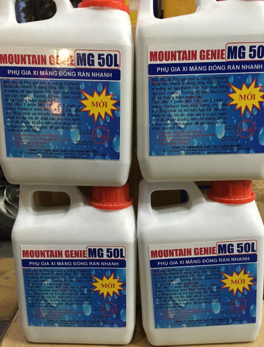 Moutain Genie MG 50L - Phụ gia xi măng đóng rắn nhanh là chất lỏng đặc biệt được sử dụng kết hợp với xi măng tạo ra vữa đóng rắn nhanh, cường độ cao, bám dính tốt có khả năng khống chế nước một cách hoàn hảo và chống thấm.
