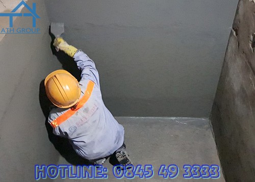- Tại các điểm nối tường và sản, xử lý sơ bộ bề mặt bằng lớp lót đầu tiên trên bề mặt bê tông, sau đó thi công lớp đầu tiên. Trong khi bề mặt phủ vẫn còn ướt, ngay lập tức trải lớp lưới thủy tinh gia cường hoặc vải polyeste lên trên rồi nhấn mạnh và đều xuống lớp dưới bằng ru lô thép. Thời gian cho phép trước khi thi công lớp thứ hai khoảng 4 giờ.
