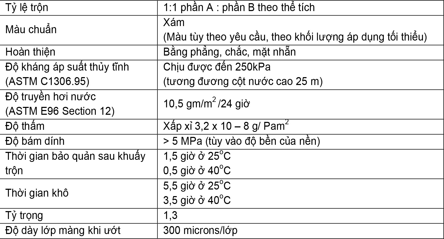 - Chống lại áp suất thủy tĩnh thuận và ngược. Ngăn nước rò rỉ và thẩm thấu qua lớp tường bên trong, sàn, và các lớp phía dưới như hầm, đường hầm, hố thang máy, tường chắn và bãi đậu xe.
