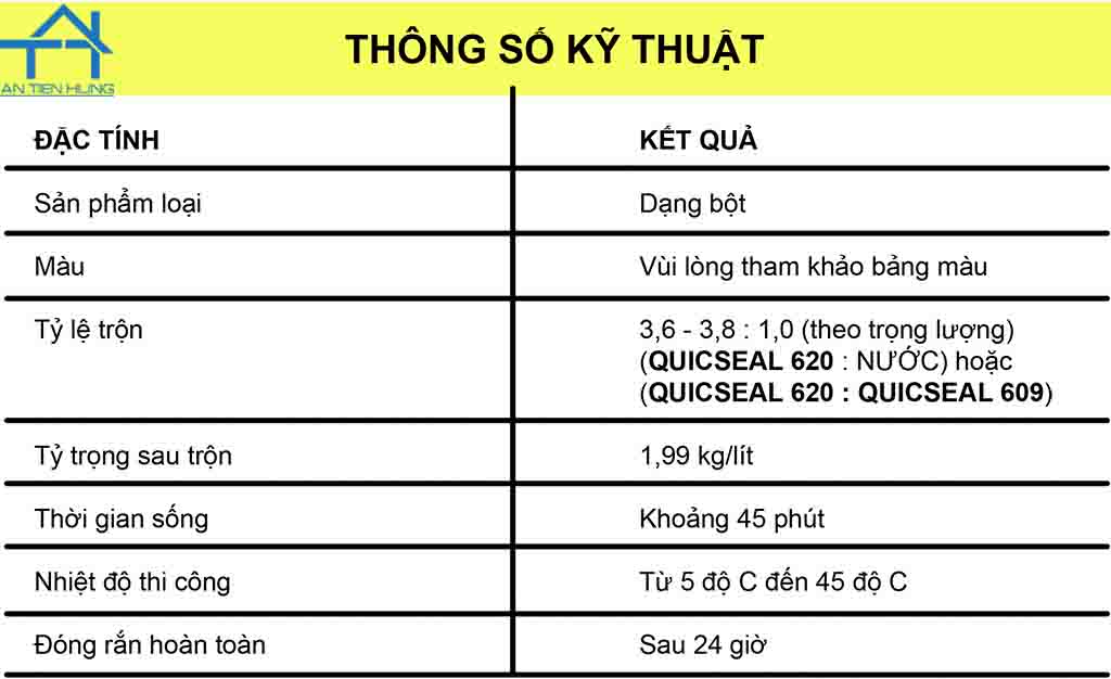 Quicseal 620 được tạo ra bởi công thức đặc biệt từ xi măng, nhựa tổng hợp, phụ gia và một số chất độn chọn lọc