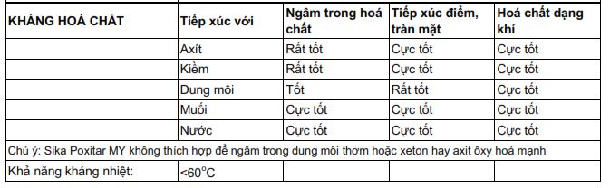 Sika Poxitar MY là chất phủ kháng hóa chất 2 thành phần, phản ứng để đông cứng, kháng hóa tốt với hàm lượng dung môi thấp, gốc epoxy- dầu than đá kết hợp thành phần khoáng chất khác.