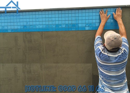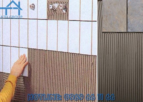 - Để tăng độ dính và độ phủ thì nên thi công 1 lớp keo ở phía sau viên gạch;