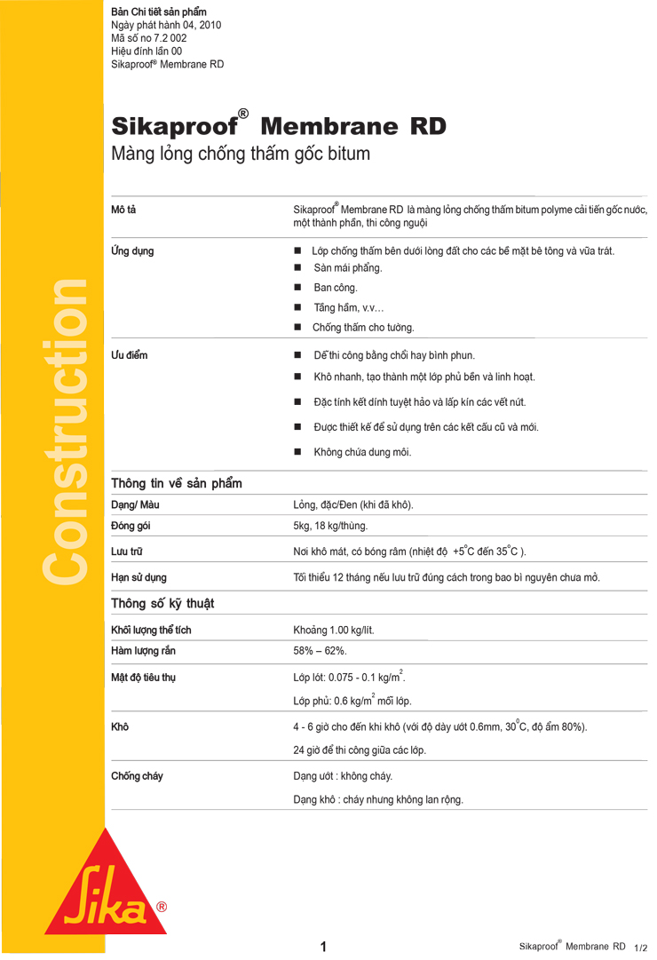 - Vì Sikaproof® Membrane RD không kháng tia UV nên các bề mặt lộ thiên (như mái phẳng) phải được bảo vệ như sơn phản chiếu hoặc lớp vữa trát.