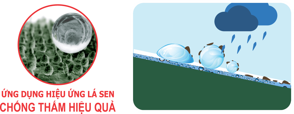 Công nghệ áp dụng hiệu ứng lá sen, giúp chống thấm hiệu quả, cuốn trôi bụi bẩn giữ bề mặt màng sơn luôn sáng đẹp.