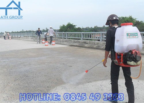- Bảo dưỡng lần 1: Sau khi bề mặt đã khô từ 2-6h (phụ thuộc vào gió và nhiệt độ môi trường), phun toàn bộ bề mặt bằng nước kể cả trong trường hợp sau 6h mà bề mặt vẫn còn ướt