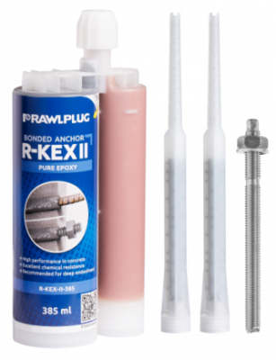 Keo cấy thép Rawlplug R-KEX II là hóa chất 2 thành phần có tỉ lệ 3:1 về thể tích gồm gốc nhựa epoxy và chất làm cứng. Hai thành phần hóa chất này sẽ được trộn đều nhau thông qua vòi trộn tĩnh khi bơm vào lỗ khoan bằng dụng cụ bơm chuyên dụng