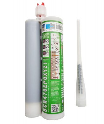 Keo cấy thép Bossong BCR 470 là keo gốc Epoxy chịu tải trọng cao (Tỷ lệ thành phần Epoxy 2-1), khô cứng nhanh và thời gian thao tác được gia tăng thích hợp cho vùng khí hậu nhiệt đới. Làm việc tốt khi lắp đặt trong lỗ khô, ẩm ướt và ngập nước.
