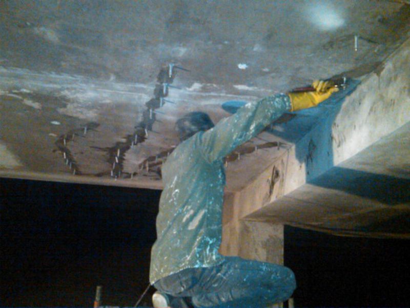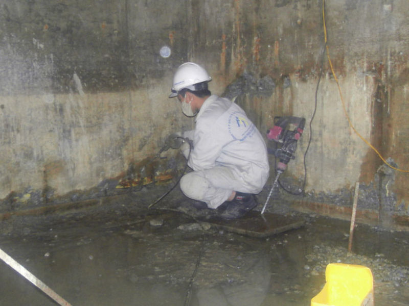 - Loại bỏ sạch các lớp vữa, hồ, xi măng bám lên bề mặt bê tông bằng các loại dụng cụ: máy mài, búa, đục sắtđục mở các đường nứt lớn xuyên sàn ( nếu có) theo rãnh rộng 1-2cm sâu 2cm, các hốc hổng, lỗ rỗ thì cần phải băm đục bỏ phần bám dính hờ, đục rông và sâu cho đến phần đặc chắc. Xung quanh miệng ống thoát nước xuyên sàn ta nên đục rộng từ 2-3 cm, sâu 3m để có thể tiếp nhận được nhiều chất chống thấm, lắp băng trương nở và gia cố bằng vữa đổ bù không co ngót.
