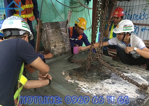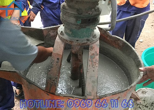 - Rót vữa sau khi đã trộn kỹ. Duy trì áp suất để giữ cho dòng chảy được liên tục không bị gián đoạn, thi công rót vữa càng nhanh càng tốt (trong vòng 15 phút sau khi trộn, ơhải đổ liên tục cho đến khi hoàn tất).